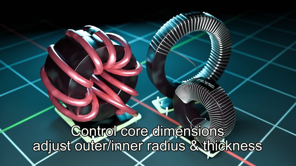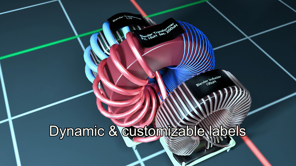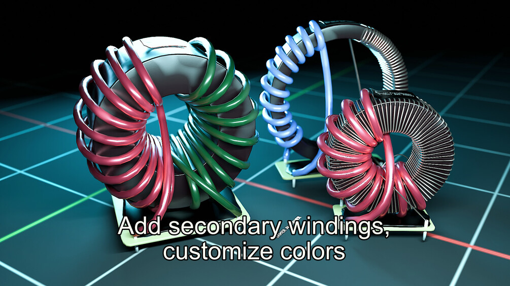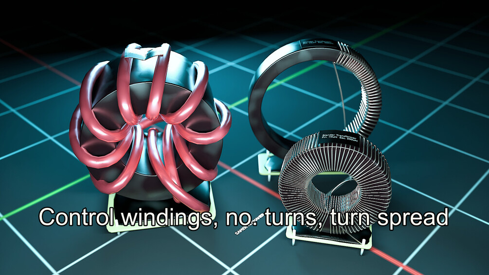 Procedural toroidal inductor generator powered by geometry nodes! Control dimensions, number of turns, winding spread, colors even terminations!